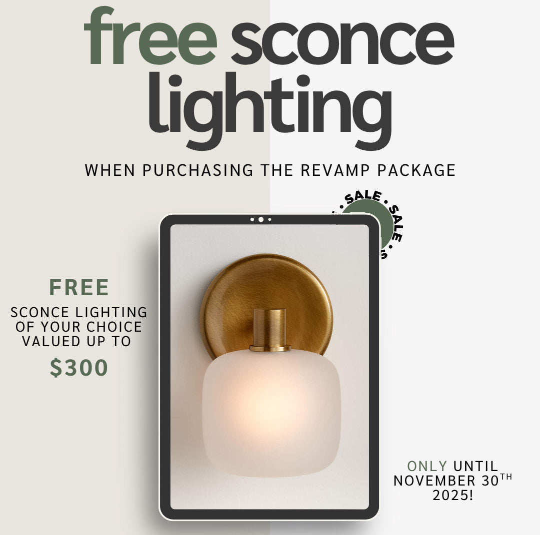 Give us a call at 226-355-1530, email us at info@theplumberswife.ca or fill out our contact form here to let us know what space you would like revamped! When you purchase The Revamp package and pay in full, you automatically qualify for your free sconce light!